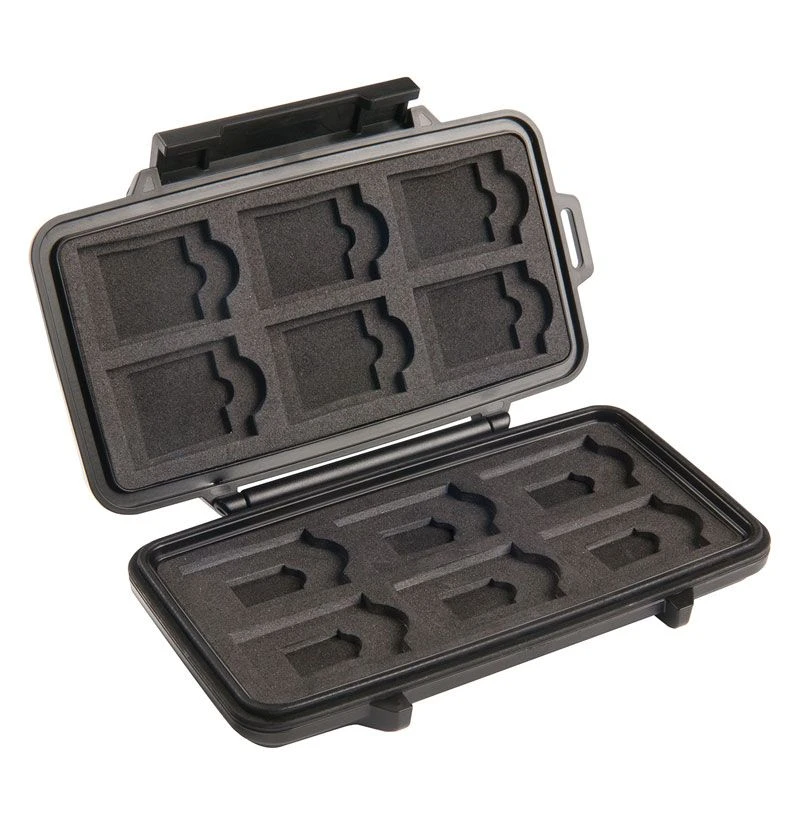 The 0915 Memory Card Case offers secure storage for memory cards. Tough, water-resistant case has removable insert liner and holds up to 12 SD, six mini SD, and six micro SD cards in form-fitting cutouts. The case is virtually indestructible and protects its contents from damage caused by water and moisture.