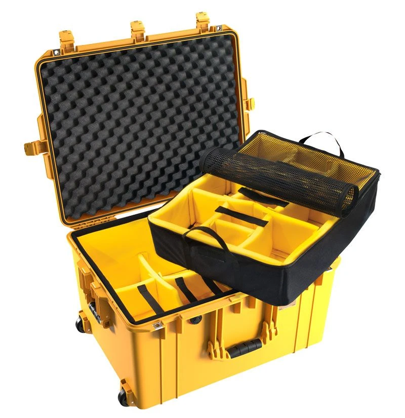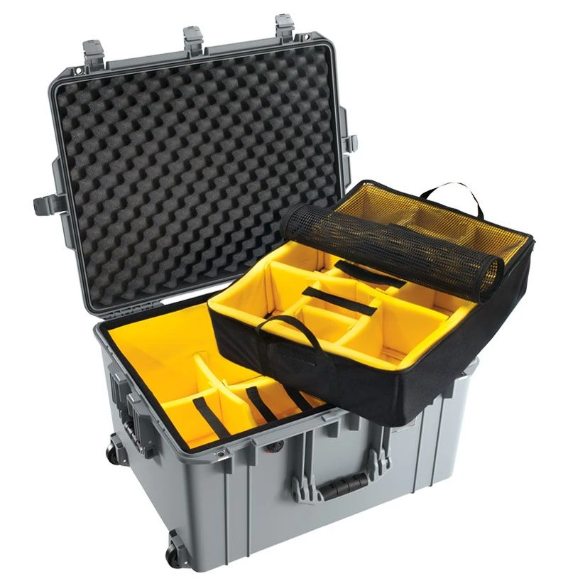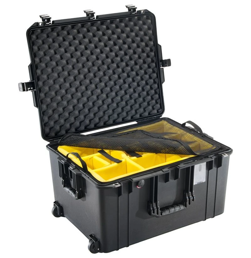 Pelican Air Protector Cases are the lightest Polymer Protector case on the planet. Up to 40% lighter. Guaranteed for life. New, high tech construction is lightweight and tough. Waterproof, dustproof and crushproof. Fully featured, the case has ABS double-throw latches that accept a user-supplied padlock, a watertight O-ring gasket, an automatic purge valve, and stainless steel hasp protectors. Users will appreciate the stylish conic curve lid shape and rubber overmolded handle. And for easier case ID, there’s an attractive and removable polycarbonate card holder that may be placed on the front or side of the case. The 1607 Air Case features quiet rolling wheels and a retractable extension handle for easy transport.