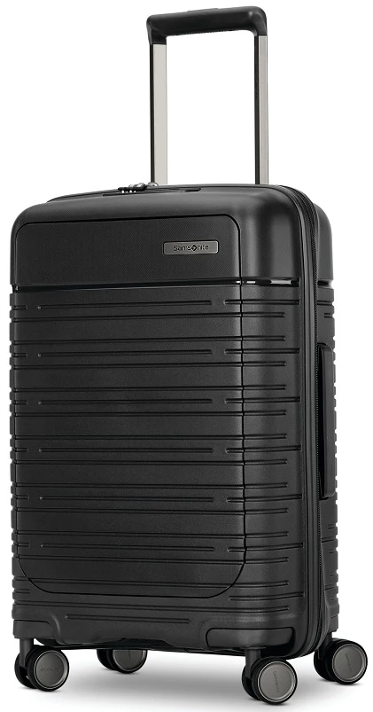 Slightly larger, the Samsonite Elevation Plus carry on spinner luggage does not always fit the template at the airport but can often be carried on board. It has a built-in TSA approved combination lock and dual spinner wheels. You can conveniently roll the Samsonite Elevation Plus carry on luggage right along beside you as you walk or rush to your destination. The dual spinner wheels allow you to easily roll it on board and down the aisle of planes or trains. Made of polypropylene, it is impact resistant. The Samsonite Elevation Plus carry on spinner luggage has a very convenient outside pocket for easy access of your essentials. It will hold your laptop and your tablet too. It also includes a pouch for your loose charging cables. We include FREE shipping and a FREE leather luggage tag monogrammed for you with your own initials. You want everyone to know thisSamsonite Elevation Plus carry on luggage is yours!