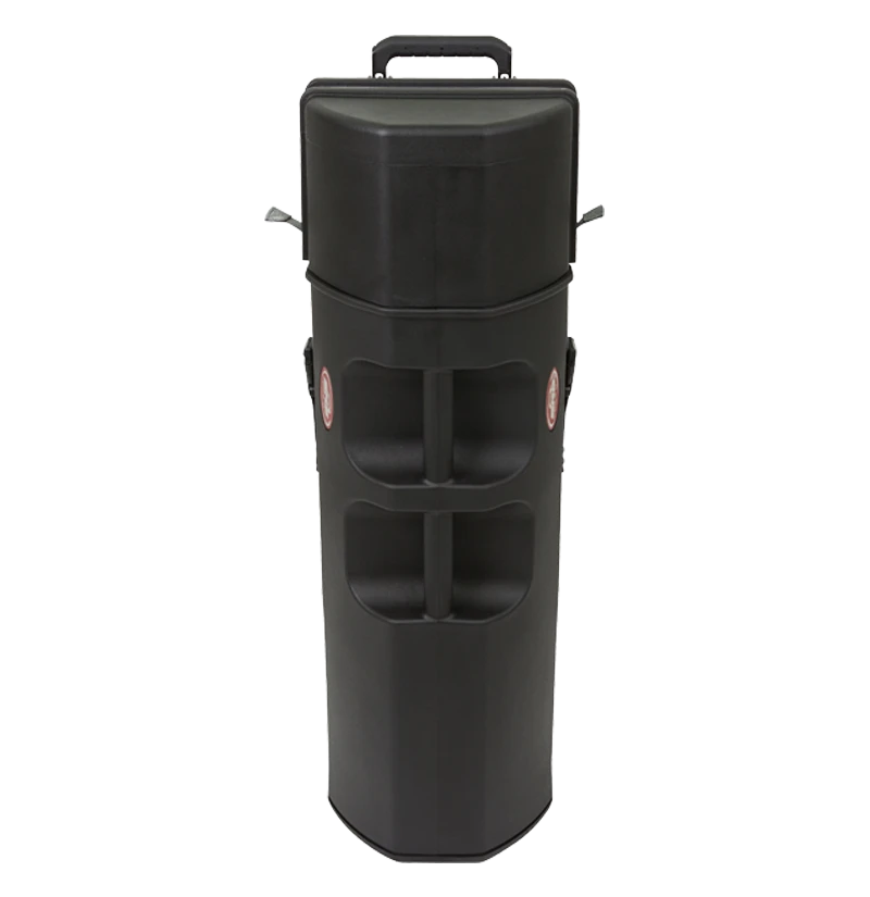 Roto molded of rugged Linear Low Density Polyethylene, this case is designed with internal foam in the base and lid to keep equipment secure and protected. The case has internal dimension of 34″ tall with a diameter of 11″, and features a removable top for easy accessibility, a sturdy, high-tension slide release buckle with heavy-duty web straps for easy closure, room on both sides to adhere shipping labels, two molded-in ergonomic carrying handles and in-line skate style wheels. This case comes with SKB‘s Unconditional Lifetime Warranty.